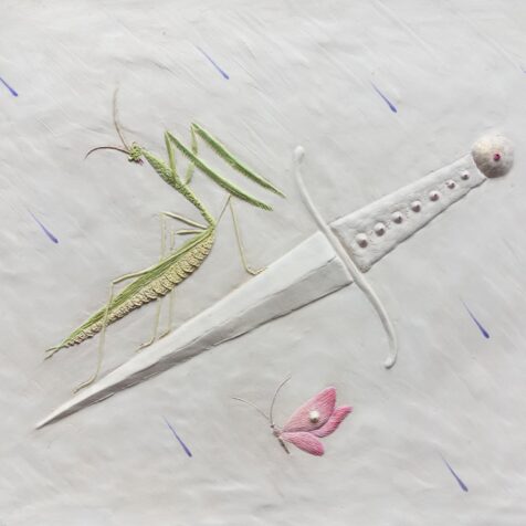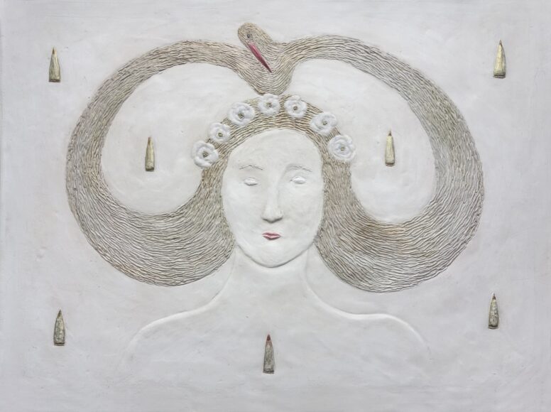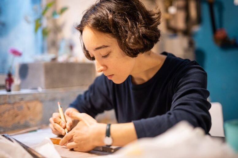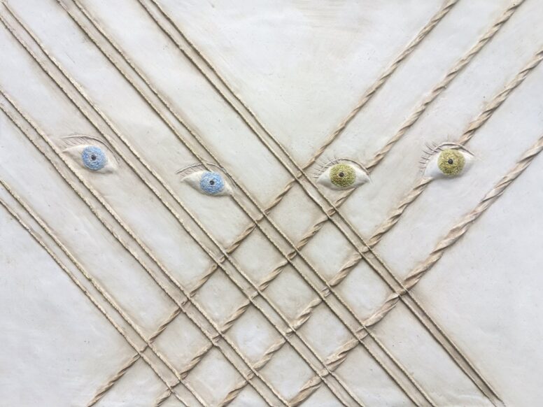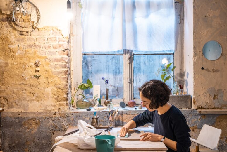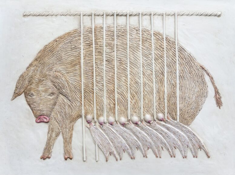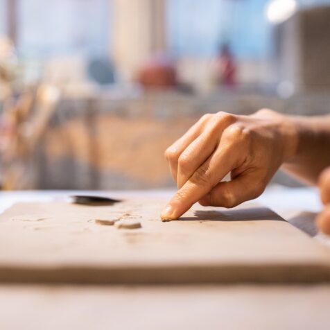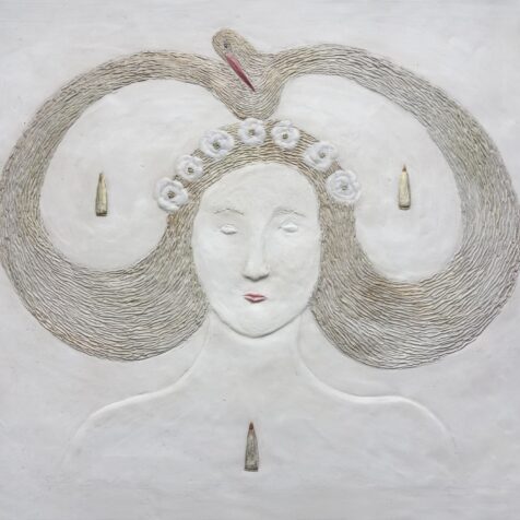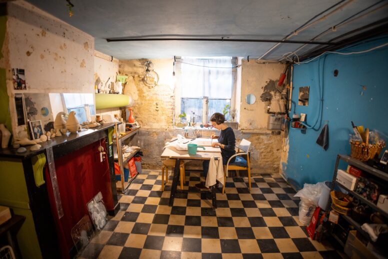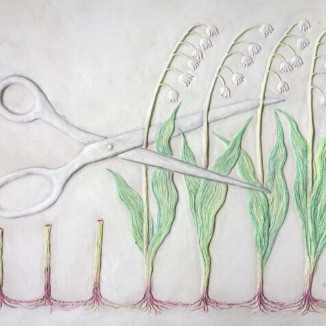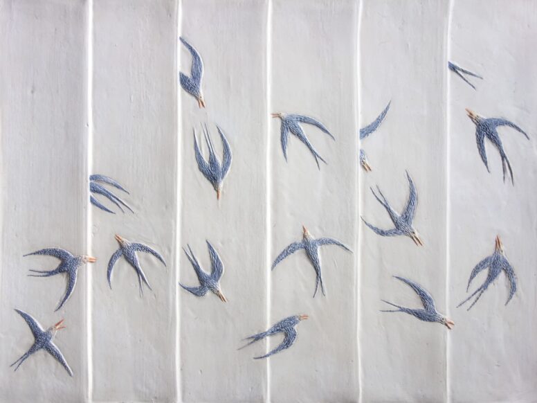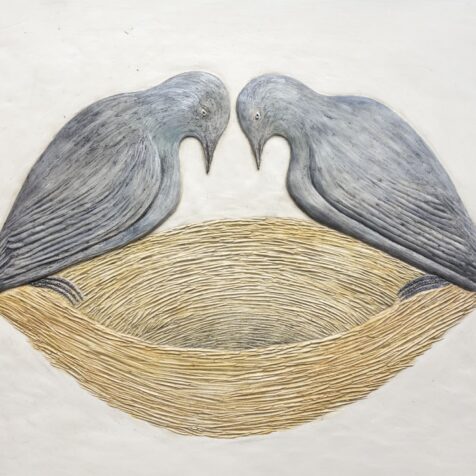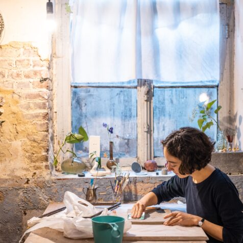 Toen ik keramiek begon te studeren kwam ik in aanraking met vele nieuwe media, waaronder gips. Gips wordt voornamelijk gebruikt om mallen te maken, om dan (meerdere) “echte” werken te creëren. Vaak blijft gips op de achtergrond, terwijl het zo’n dankbaar en interessant materiaal is. Ik ben ook gefascineerd door de metamorfose dat de gips doorgaat – poeder, vloeibaar, vast – en hoe fijn dat hij krassen van op de klei kan overnemen. Zo kan ik heel vrij en spontaan werken op een kleiplaat – die ik telkens hergebruik door de vorige tekening uit te wissen – en daar een gipsen afgietsel van te nemen. De gips speelt de hoofdrol en ik maak maar één gietsel dus het is telkens een uniek werk. Dat vind ik een boeiend contrast met de associaties die gips heeft van louter hulpmiddel en voor serieproductie.